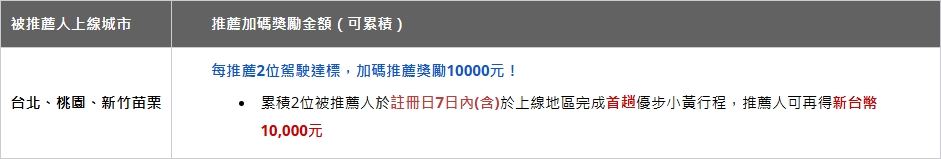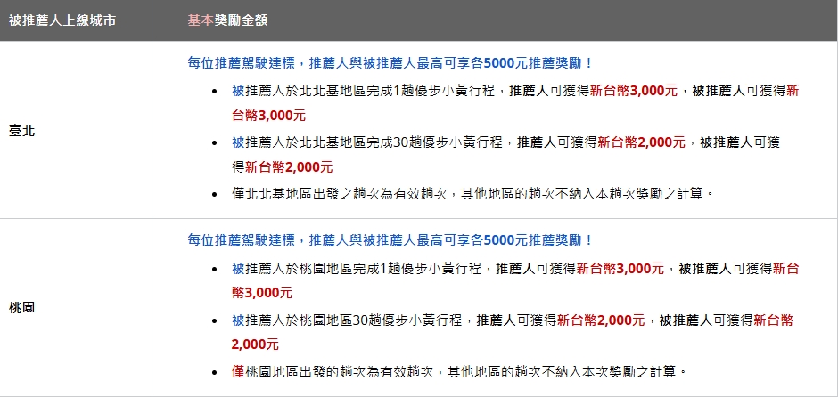 - 被推薦人只要使用邀請連結註冊開通,並在指定時間完成指定趟次,即可獲得獎勵