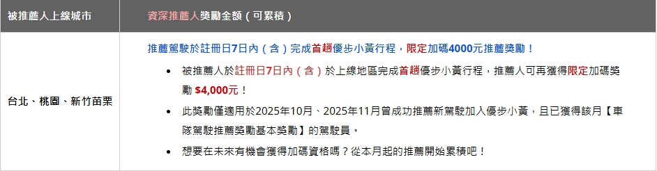 3.被推薦人需為於 2025/12/01 至 2025/12/31 期間,首次註冊 Uber 網際網路系統並完成開通帳號之職業駕駛。