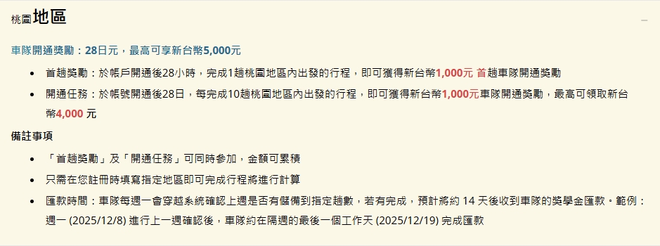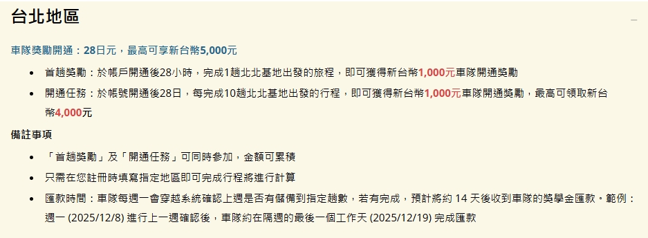 5. 車隊每週一會透過系統確認駕駛上週是否達標,統計完成後,駕駛將於約 14 天後收到車隊的獎勵匯款。舉例:週一 (2024/07/08) 進行上一週確認後,車隊將在最晚隔週的週五 (2024/07/19) 完成匯款。若您因獲得獎勵和/或回饋而產生繳稅義務,該等稅費由您負擔,車隊可能依據稅法要求而預先扣繳。
