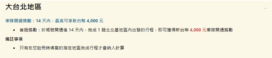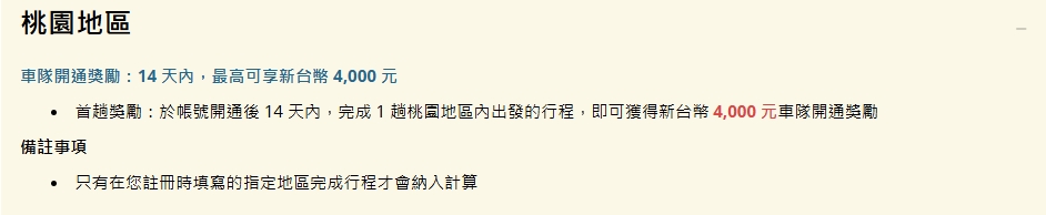 3. 若您於申請本方案後,系統有偵測或註記異常情形(例如:多次惡意取消、規避行程、評分過低等)或違反駕駛相關規範(例如:危險駕駛、不當騷擾行為等)您的方案資格將受影響。